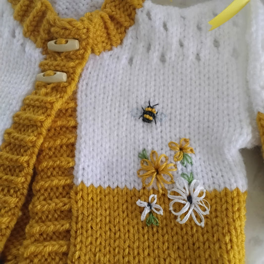 Hand Knitted Girls Cardigan Set with Bow Headband & Boots, Daisy & Bumblebee Embroidery