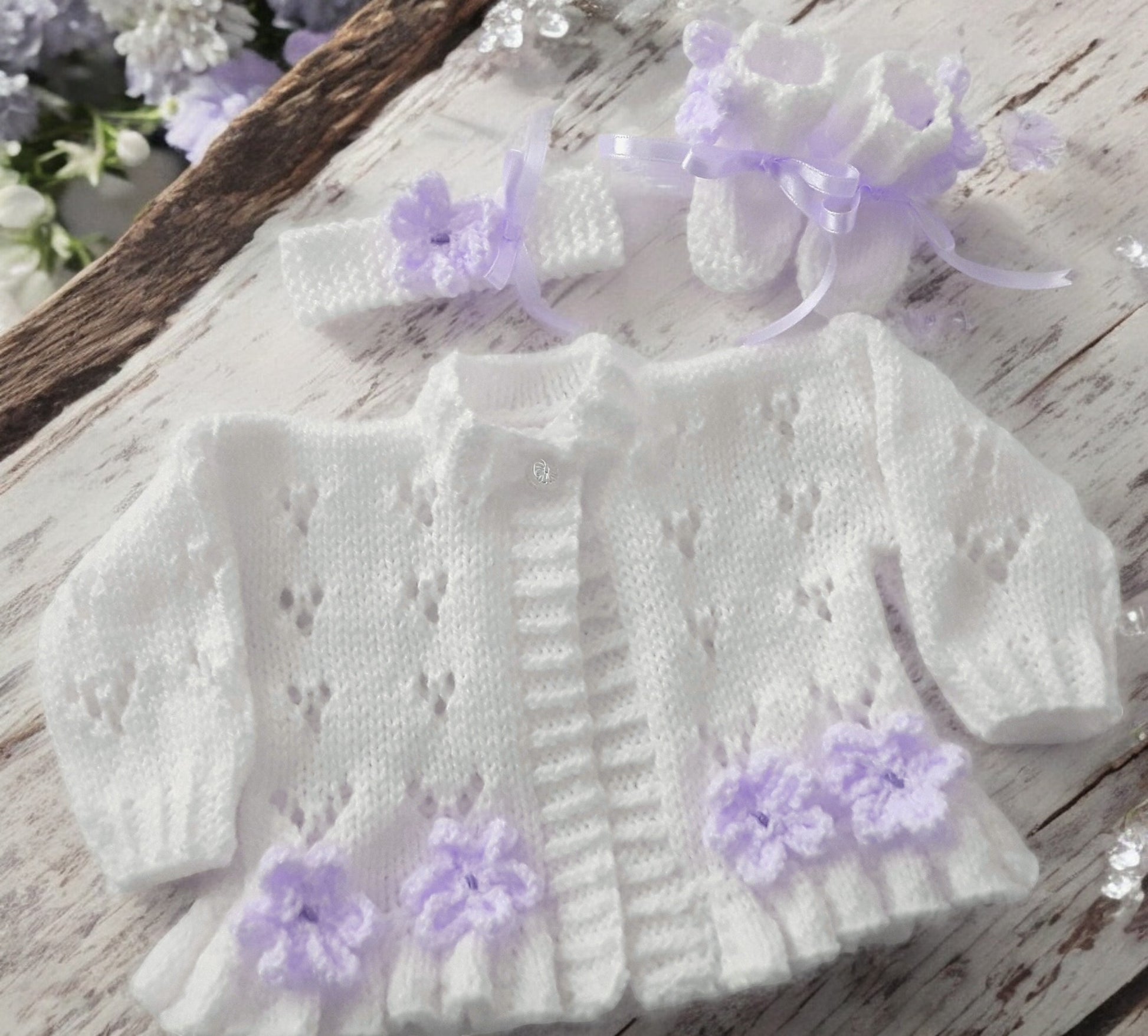 Girls Knitted Outfit – Cardigan, Headband & Boots Trimmed with Spring-Summer Flowers