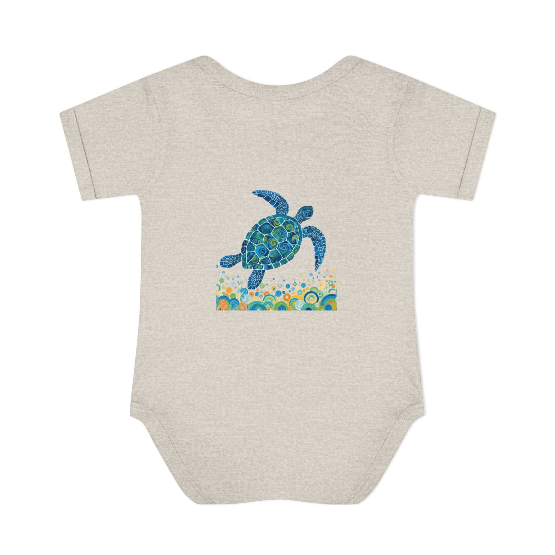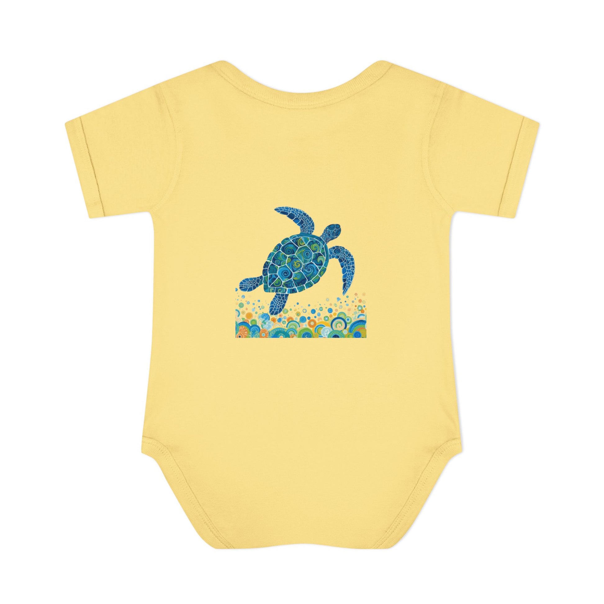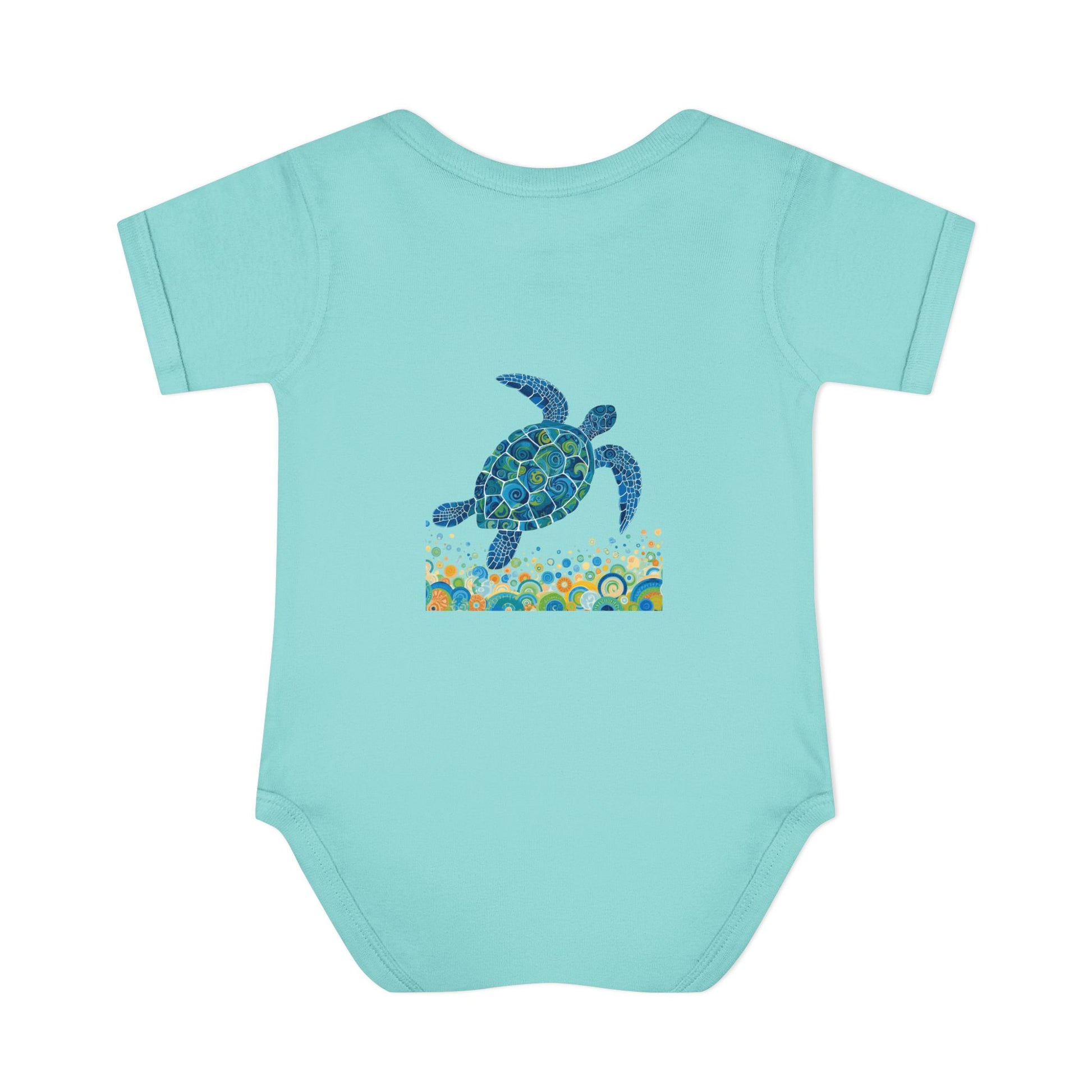 Soft, ocean-kissed comfort for tiny explorers. This infant rib bodysuit features a hand-painted sea turtle motif in calming blues and teals, swimming above a playful band of bubbles and coral-inspired shapes. Lightweight and breathable, the rib knit holds its shape through washes while the lap shoulder and three-snap closure make dressing and diaper changes gentle and simple. The comfortable cotton fabric and tear-away label keep fussy skin happy, while the subtle printed neck label keeps the neckline smooth. Let this little romper bring a bit of seaside wonder to naps, stroller walks, and sunny family days at the shore. Product features - Soft 1x1 rib knit retains shape - Lap shoulder for easy dressing - Innovative three-snap closure with smooth snap tape - Lightweight 100% combed ringspun cotton (varies by color) - Tear-away label and DTF printed neck label for comfort Care instructions - Do not iron - Machine wash: cold (max 30C or 90F) - Non-chlorine: bleach as needed - Tumble dry: low heat - Do not dry clean