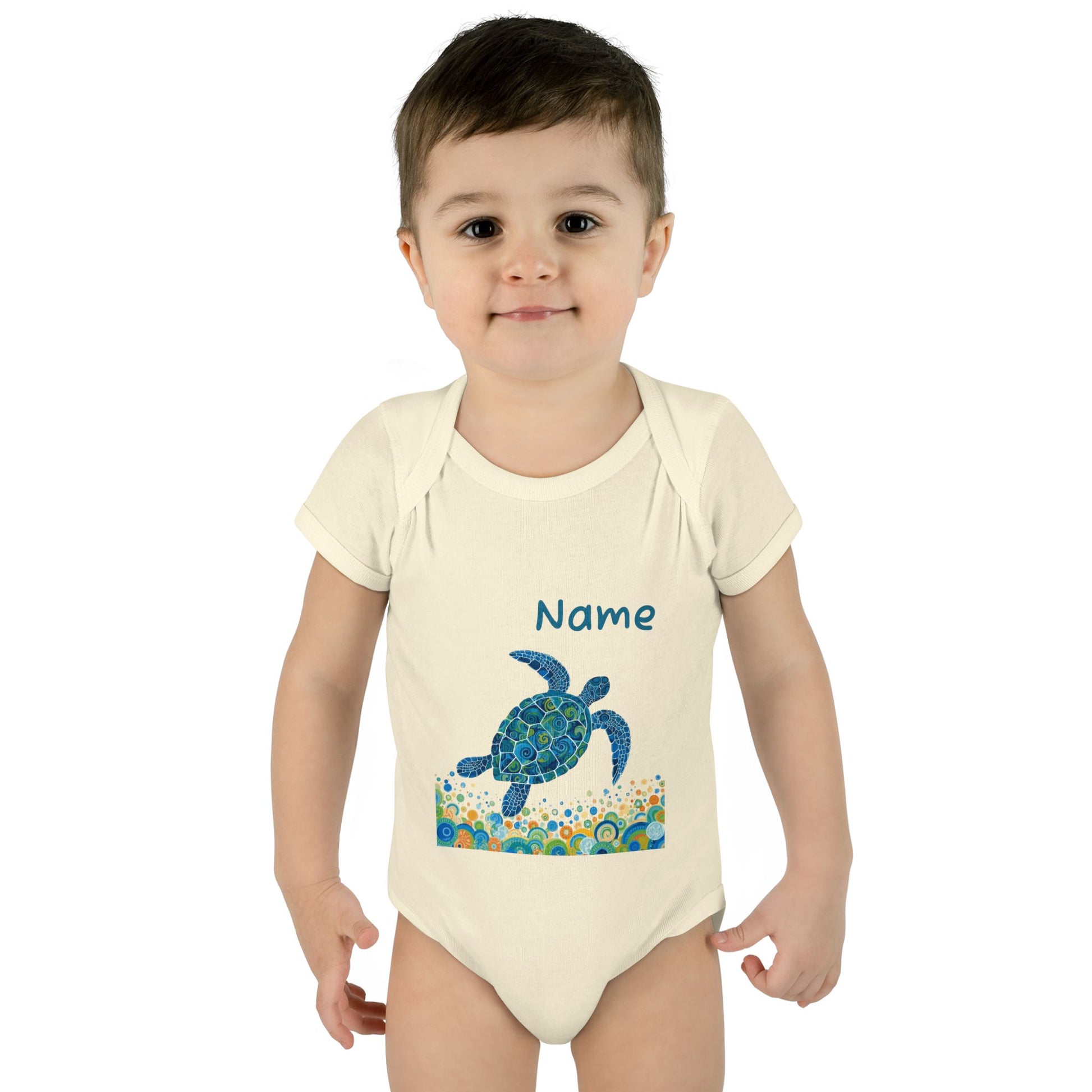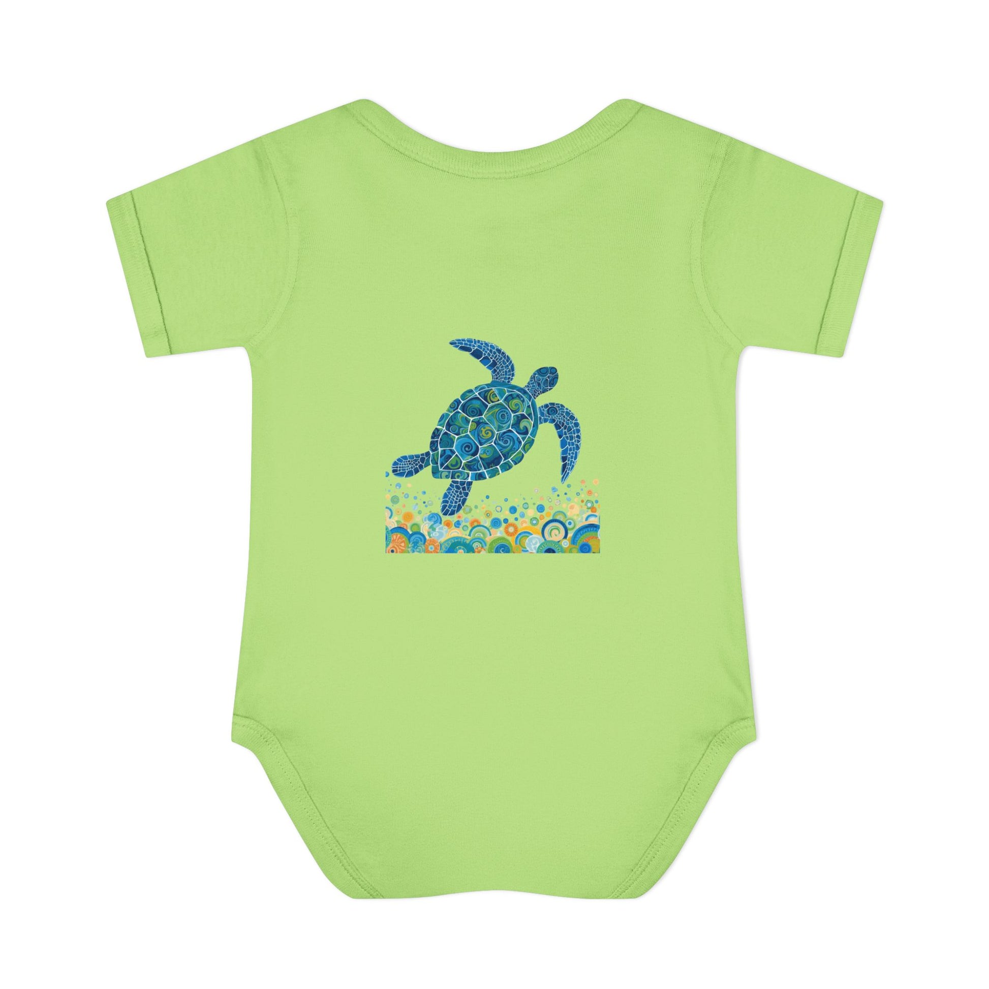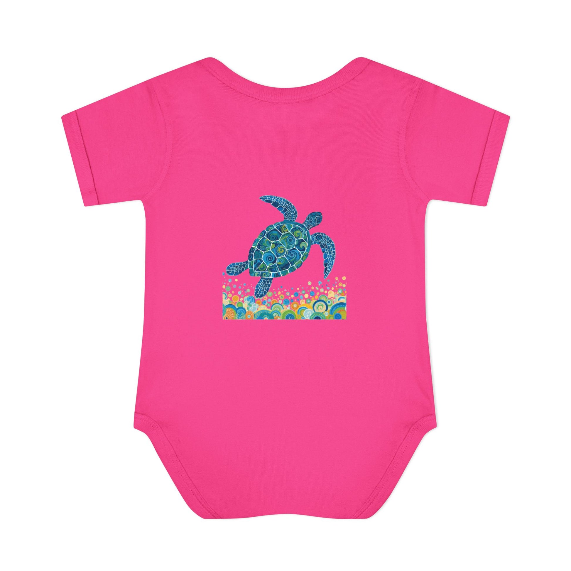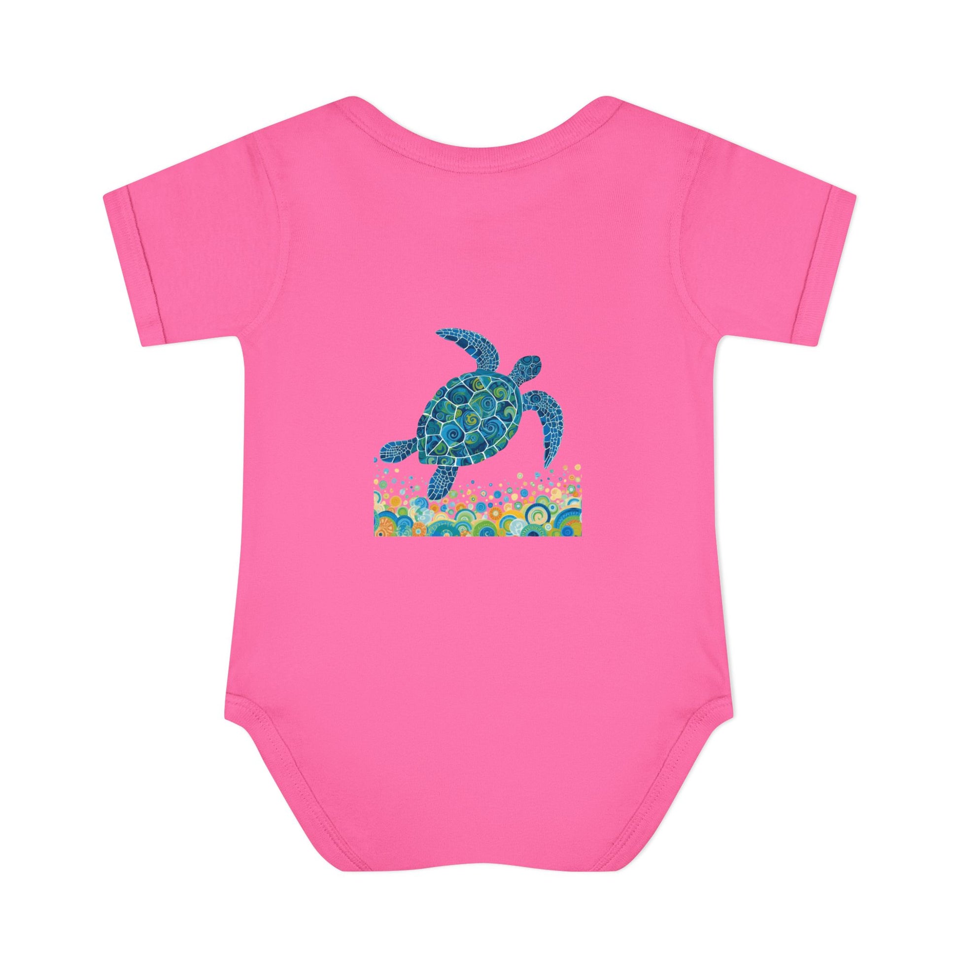 Soft, ocean-kissed comfort for tiny explorers. This infant rib bodysuit features a hand-painted sea turtle motif in calming blues and teals, swimming above a playful band of bubbles and coral-inspired shapes. Lightweight and breathable, the rib knit holds its shape through washes while the lap shoulder and three-snap closure make dressing and diaper changes gentle and simple. The comfortable cotton fabric and tear-away label keep fussy skin happy, while the subtle printed neck label keeps the neckline smooth. Let this little romper bring a bit of seaside wonder to naps, stroller walks, and sunny family days at the shore. Product features - Soft 1x1 rib knit retains shape - Lap shoulder for easy dressing - Innovative three-snap closure with smooth snap tape - Lightweight 100% combed ringspun cotton (varies by color) - Tear-away label and DTF printed neck label for comfort Care instructions - Do not iron - Machine wash: cold (max 30C or 90F) - Non-chlorine: bleach as needed - Tumble dry: low heat - Do not dry clean