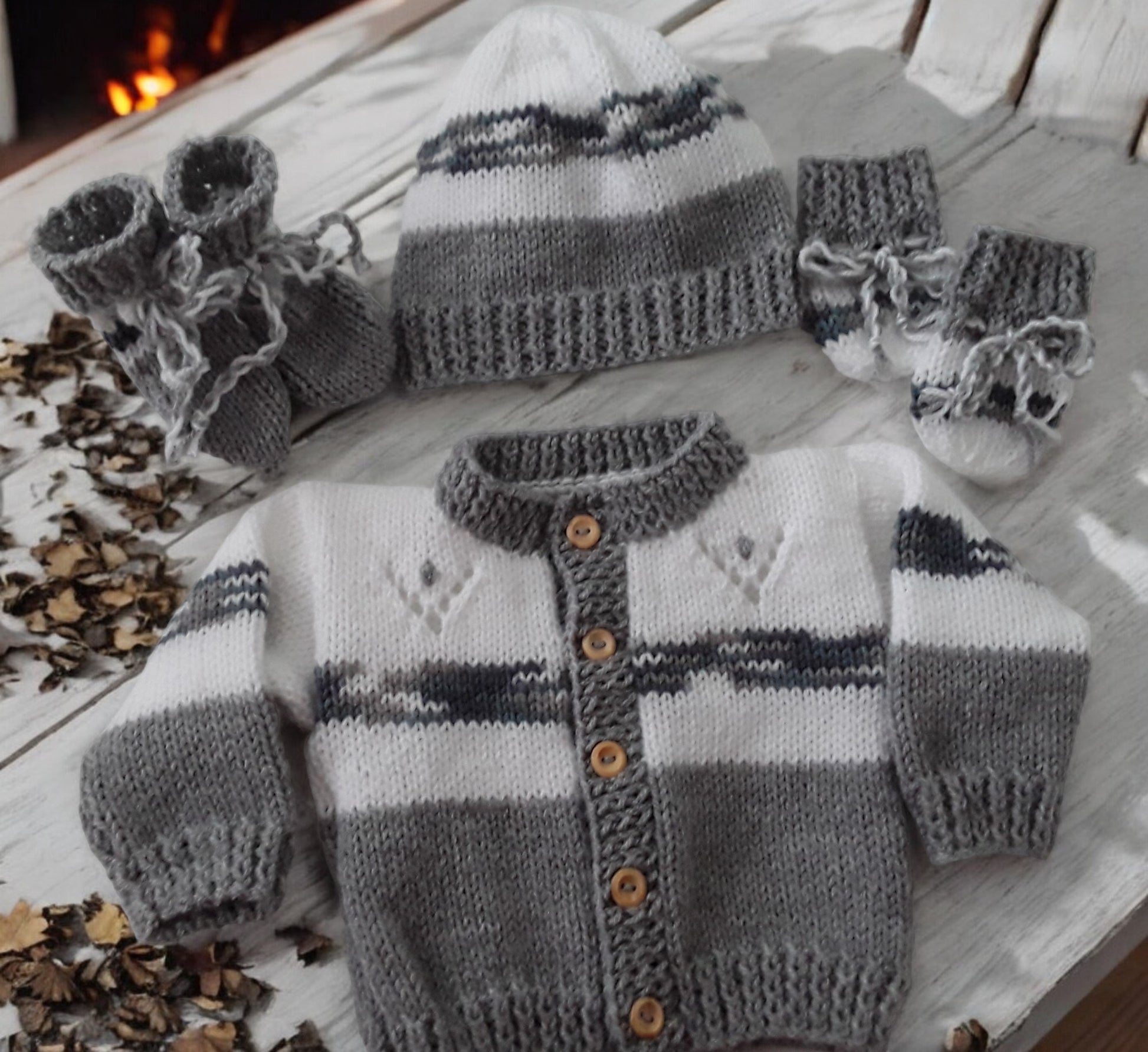 Boys' Star and Stripe Knitted Cardigan with Matching Hat and Boots – Playful Baby Boy Outfit