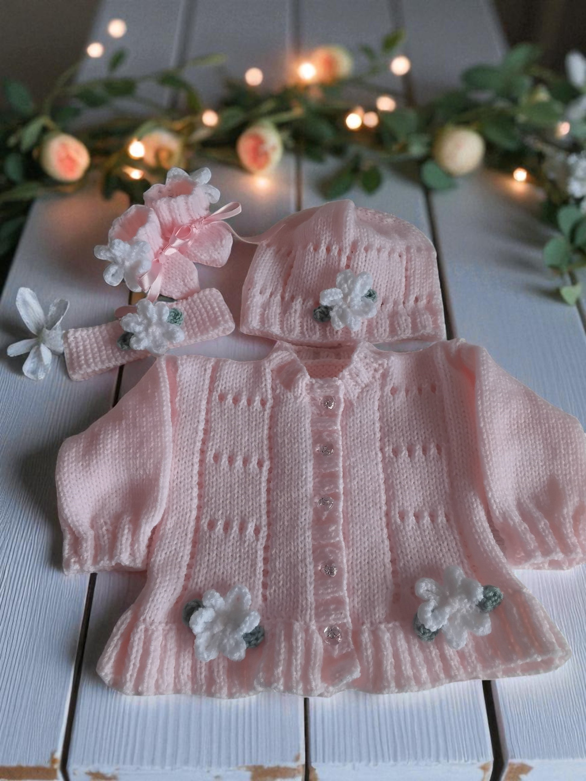 Introducing our adorable knitted baby girl cardigan with a charming fluted hem and delicate flower & leaf trim comes with matching hat, headband & boots. This darling little sweater is perfect for keeping your little one cozy and stylish. Made from soft, baby acrylic yarn, it's perfect for all seasons. The cardigan comes in a variety of lovely colors, making it easy to match with any outfit. Available in sizes from preemie to 2 years, this delightful cardigan with its matching accessories makes your little princess perfectly coordinated from head to toe. Treat your little one to this lovely cardigan and watch her bloom!