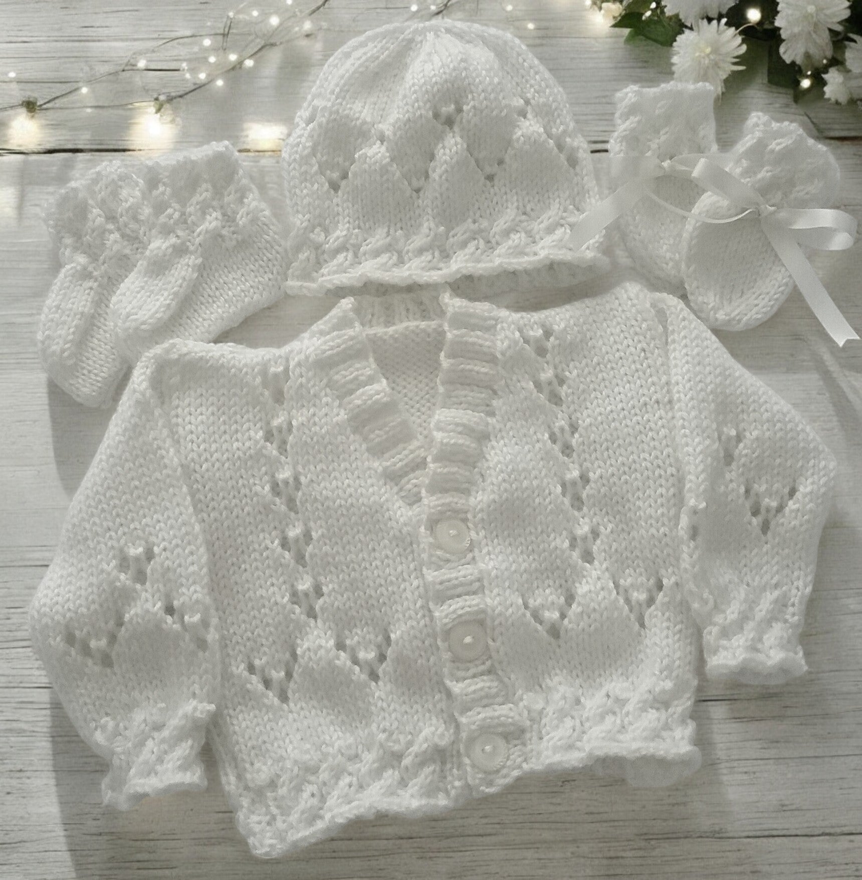 Wrap your little one in the timeless charm of this hand-knitted baby outfit featuring classic cable knit ribs. This beautifully crafted 4-piece set includes a cozy cardigan, matching hat, mittens, and booties, all designed with intricate cable detailing. The soft acrylic baby yarn ensures both comfort and warmth while being easy to care for, making it perfect for daily wear.