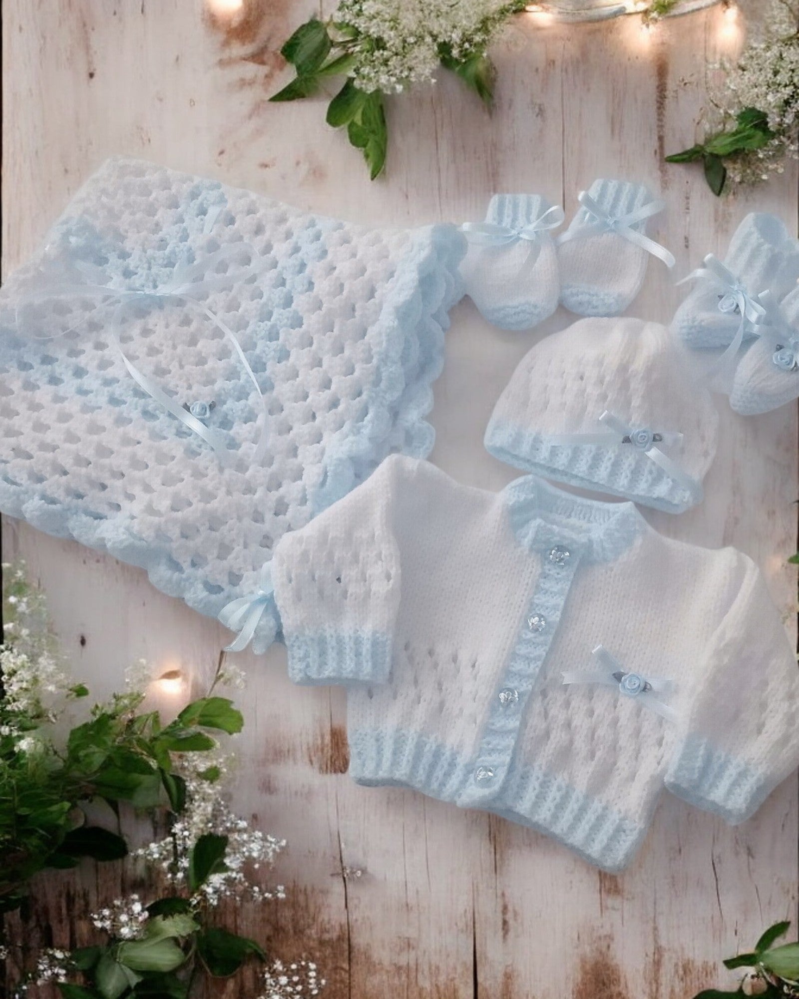 Hand-Knitted Baby Girl Outfit with Matching Pram Cover – Cardigan, Hat, Booties, mittens & Blanket Set