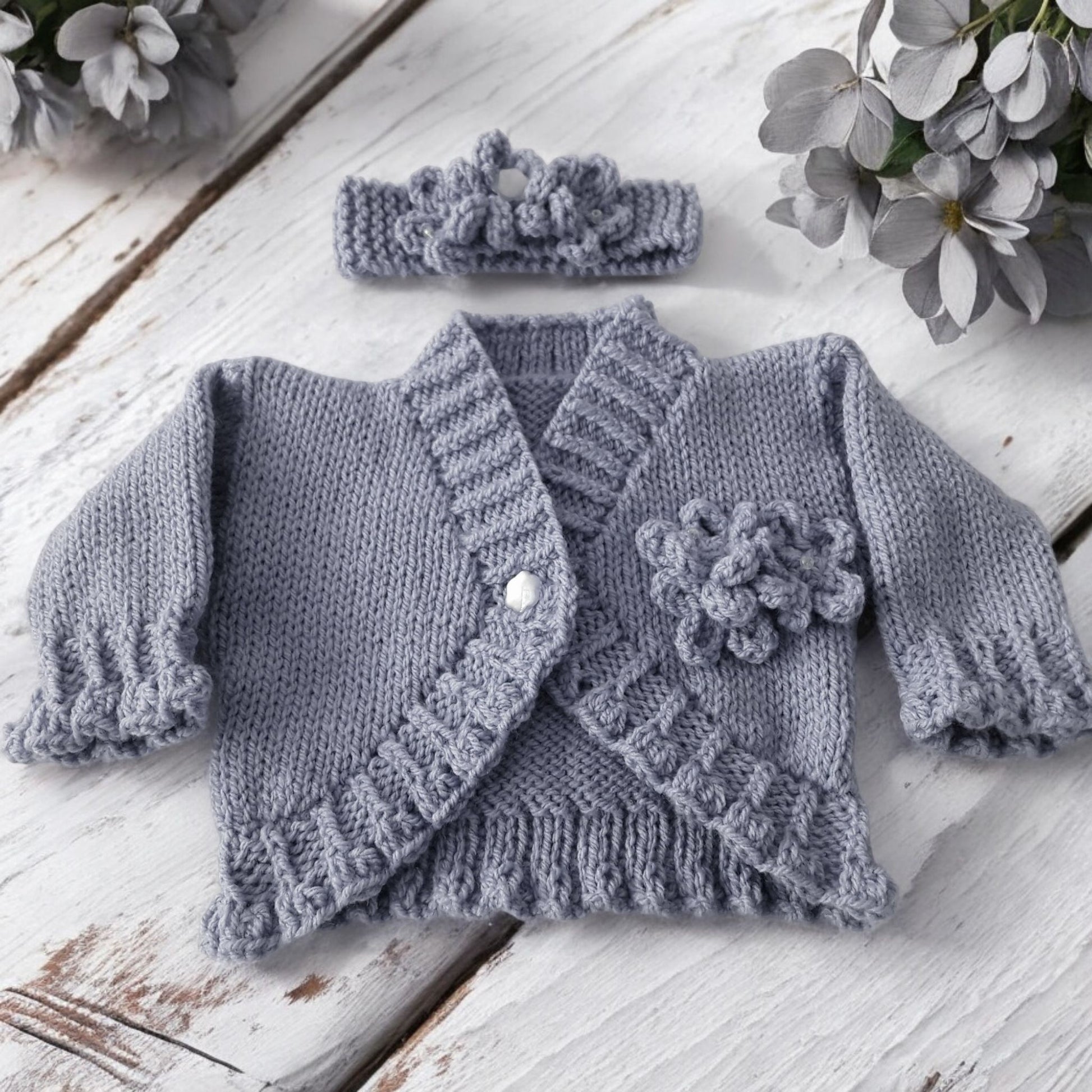 Hand Knitted Bolero Style Girls Cardigan with Knitted Flowers & Matching Headband – Perfect for Spring & Summer
