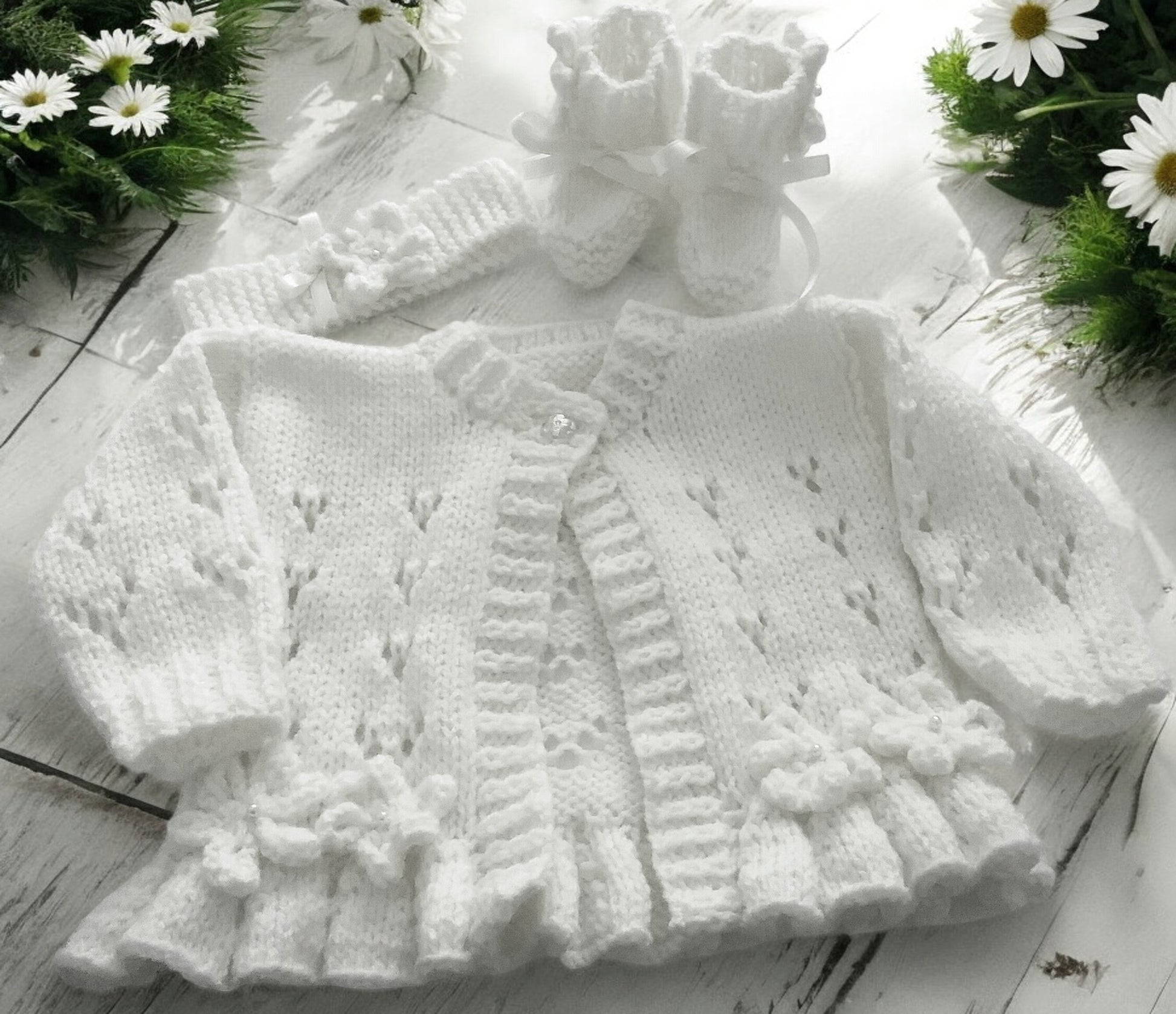 Hand-Knitted Baby Girl Cardigan with Fluted Hem & Flower trim with headband and booties
