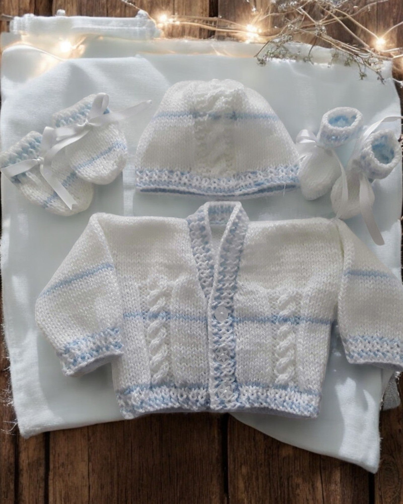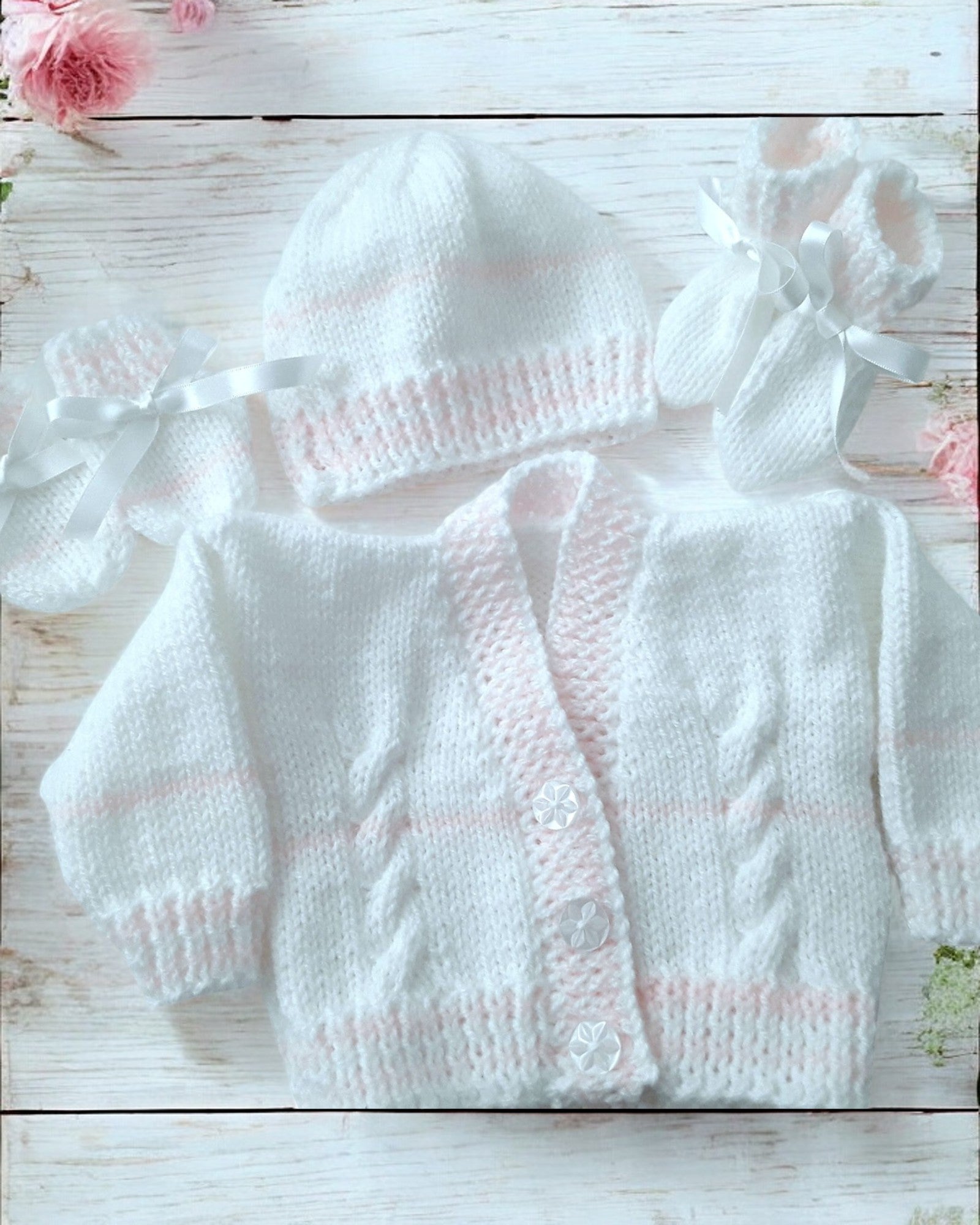 Cozy Stripy Knit Baby Ensemble – Cardigan, Hat, Mittens & Booties